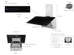 Máy có chiều ngang là 90cm, dễ dàng lắp đặt và tương thích với nhiều kiểu nhà bếp hiện đại. Đi kèm với đó là đường ống thoát khí là 150mm có khả năng hút mạnh mẽ.