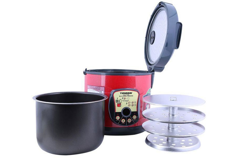 Đặc biệt, thiết bị có khay chứa tỏi bằng hợp kim nhôm được thiết kế 3 tầng với mâm phát nhiệt tuần hoàn 360o (có thể phát nhiệt 3 chiều) tăng hiệu quả truyền nhiệt, giúp tỏi đen được làm ra đồng đều. Bên cạnh đó, máy làm tỏi TIROSS TS908 được thiết kế thêm 1 van điều tiết hơi nước tự động, giúp điều chỉnh nhiệt độ và độ ẩm theo đúng theo quy trình, đảm bảo tỏi đen làm ra hạn chế được tình trạng bị ướt và nhão sau mỗi lần lên men
