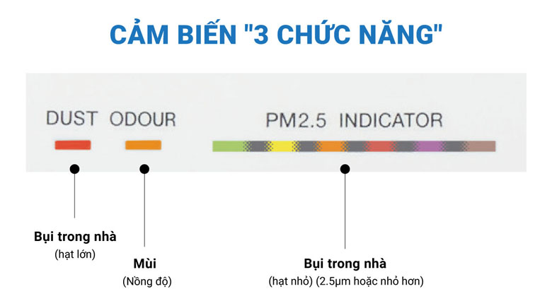 Máy lọc không khí được trang bị cảm biến “3 chức năng” thông minh, nhanh chóng phát hiện bụi mịn PM2.5, bụi thường và mùi hôi