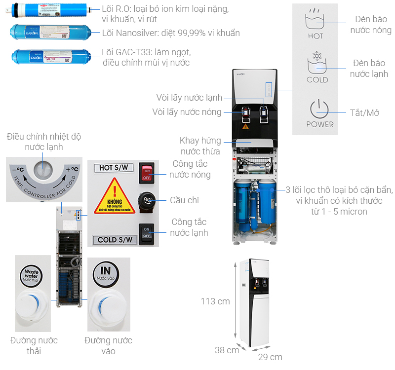 Nhiệt độ làm nóng nước 85 – 95 độ C, nhiệt độ làm lạnh nước từ 6 – 10 độ C, trang bị công tắc nóng/lạnh riêng, có thể điều chỉnh nhiệt độ nước lạnh tiện lợi
