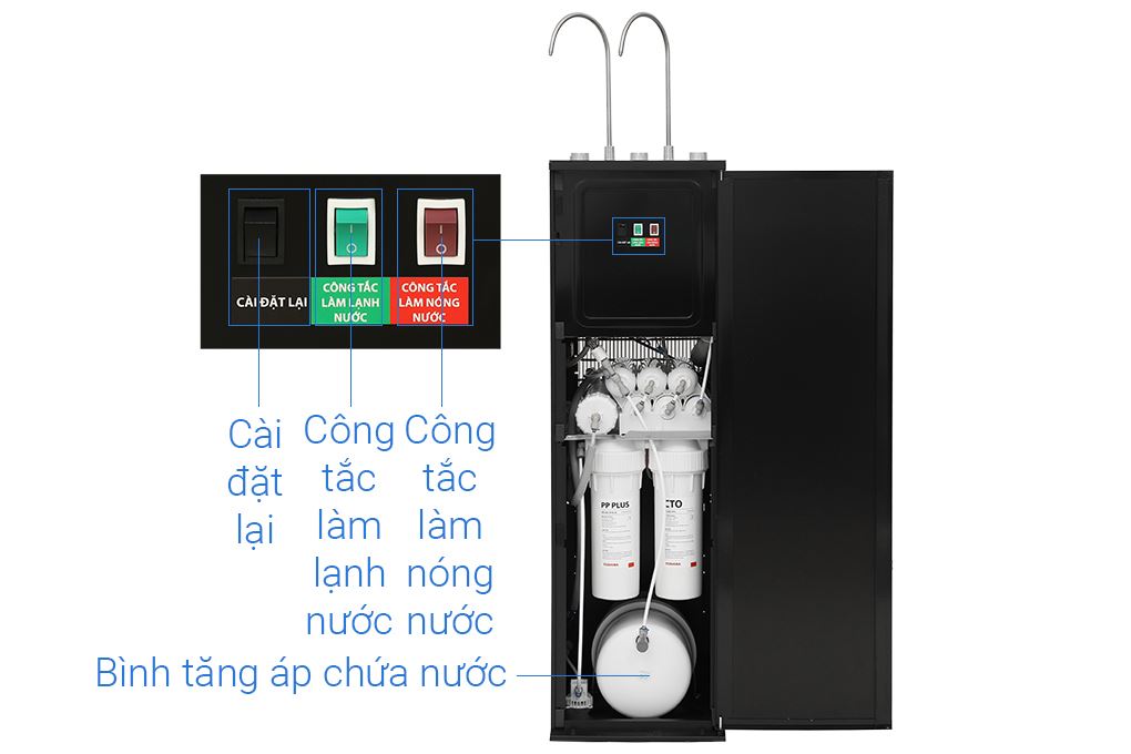 Bình chứa nước tổng dung tích 10.2 lít được chia rõ ràng cho nước nóng, lạnh và nước thường, giúp bạn dễ dàng sử dụng cho nhiều mục đích khác nhau trong sinh hoạt hàng ngày.