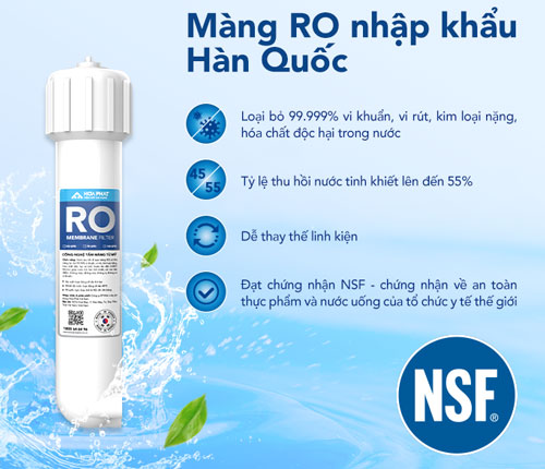 Hơn thế, màng lọc RO này còn đạt chứng nhận NSF – là chứng nhận an toàn thực phẩm và nước uống của tổ chức Y tế Thế giới để người dùng yên tâm sử dụng.
