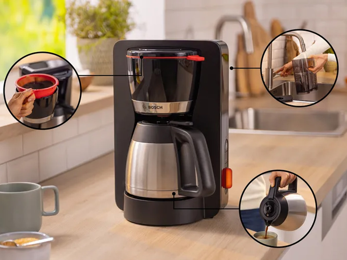 Bosch TKA6M273 thuộc dòng máy pha cà phê nhỏ giọt với kiểu dáng hình chữ nhật đứng, chiều cao khoảng 34,7 cm, giúp tối ưu diện tích sử dụng trong nhiều không gian khác nhau. Nhờ thiết kế gọn gàng, người dùng có thể dễ dàng đặt máy trên bàn bếp, bàn làm việc, quầy bar mini hoặc trong văn phòng mà không gây cảm giác chật chội. Tông màu đen kết hợp với các chi tiết inox tạo nên tổng thể hài hòa, phù hợp với nhiều phong cách nội thất từ hiện đại đến tối giản. Thiết kế này cũng góp phần giúp việc vệ sinh bên ngoài máy trở nên đơn giản hơn trong quá trình sử dụng lâu dài.