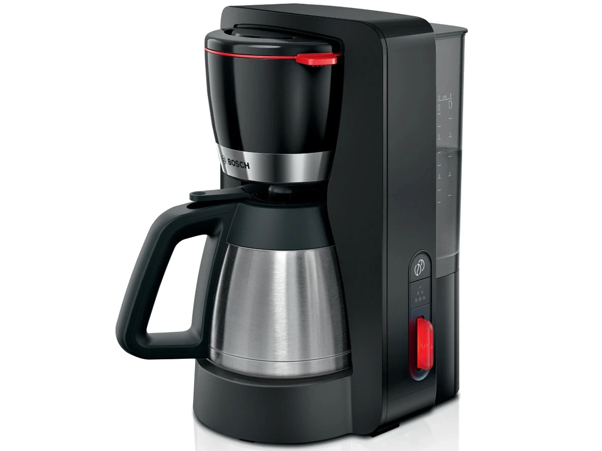Bosch TKA6M273 đi kèm bình inox cách nhiệt, giúp giữ ấm cà phê trong một khoảng thời gian sau khi pha. Ngoài ra, máy còn có thang đo mực nước hiển thị rõ ràng ở mặt bên, giúp người dùng dễ dàng kiểm soát lượng nước cần sử dụng. Điều này góp phần hạn chế pha dư hoặc thiếu so với nhu cầu thực tế.