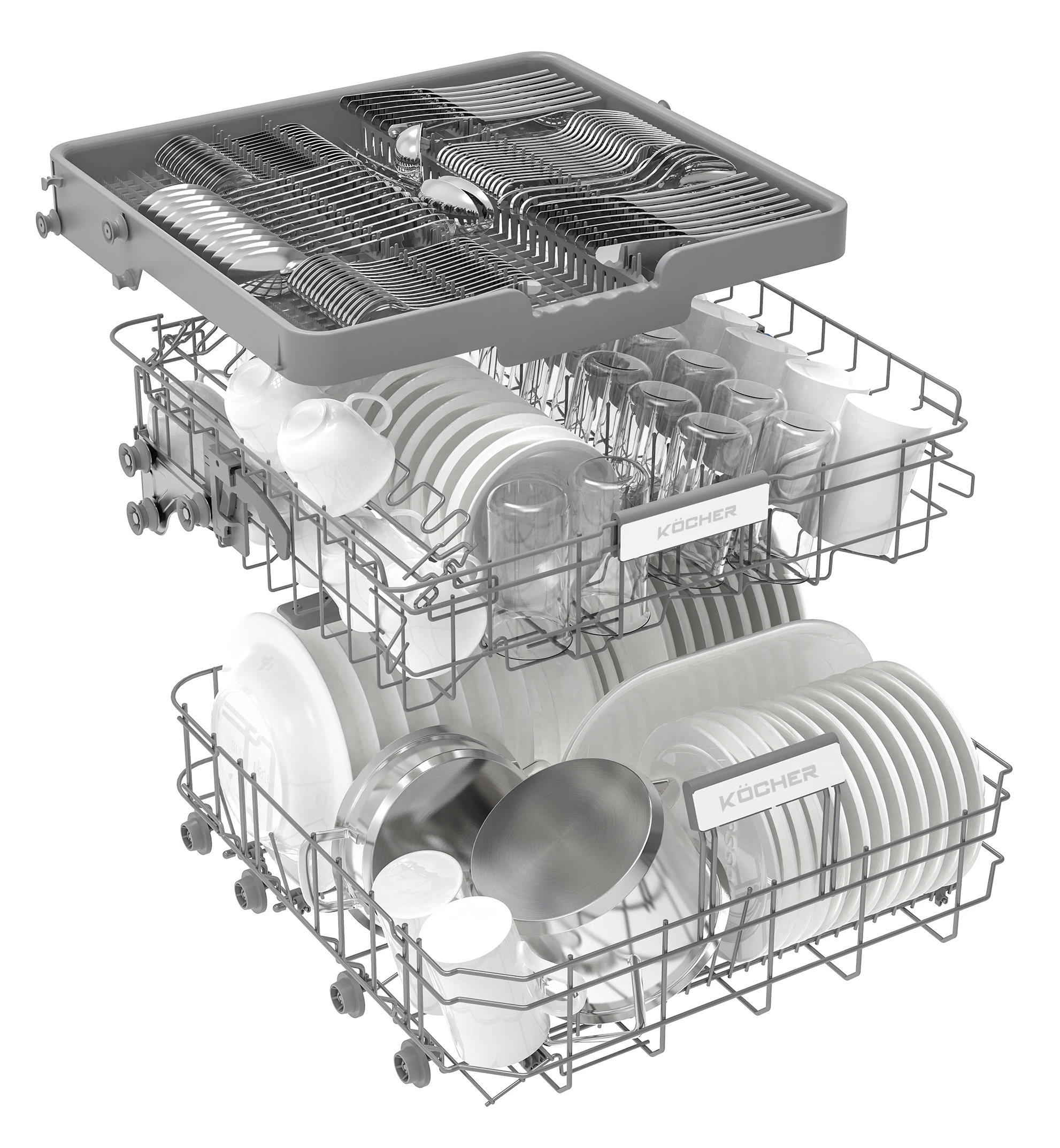 Máy rửa bát Kocher KDEU-X15B trang bị 3 khay chứa cơ động.