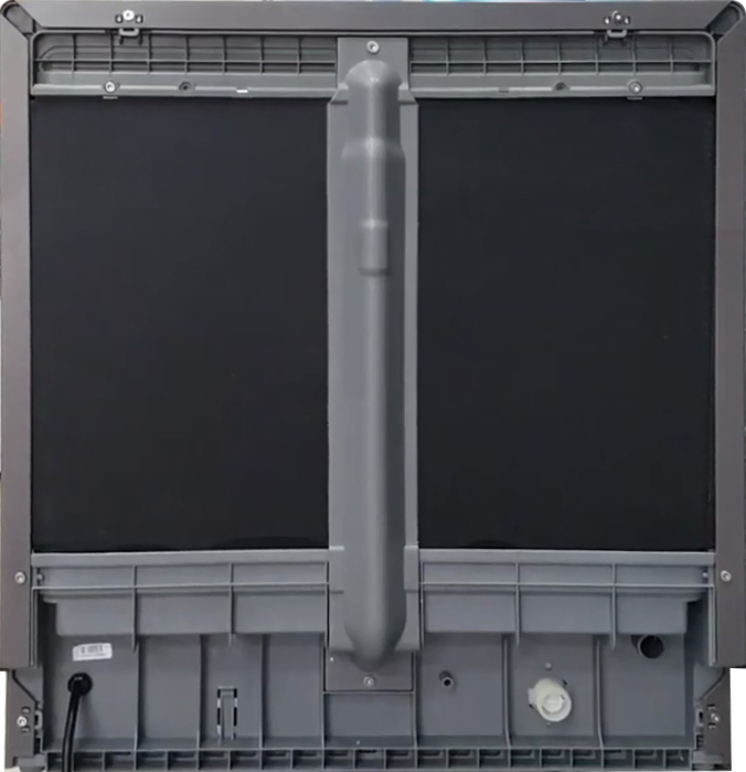 Mặt đằng sau sẽ toàn bộ khung màu đen và xám, chứa ống thoát nước dài 158cm và ống cấp nước dài 154cm. Ngoài ra còn hệ thống dây điện dài 149cm. Tất cả những vật dụng liên quan đến dây điện, ống dẫn nước được sắp xếp ở mặt sau để tiết kiệm diện tích và đảm bảo tính thẩm mỹ cho máy rửa bát Latino ESB08LT.
