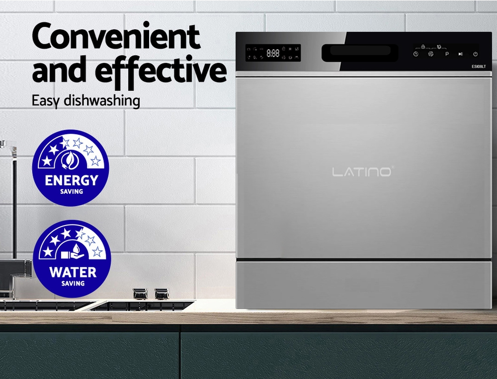 Máy rửa bát 8 bộ Latino ESI08LT có nhiều điểm ấn tượng, độc đáo và mới lạ hơn so với nhiều loại máy rửa bát thông thường. Chất liệu của máy là thép không gỉ, bền chắc, toàn thể thân máy sử dụng tông màu bạc và đen bóng sạch, đẹp tạo cảm giác sang trọng, hiện đại.