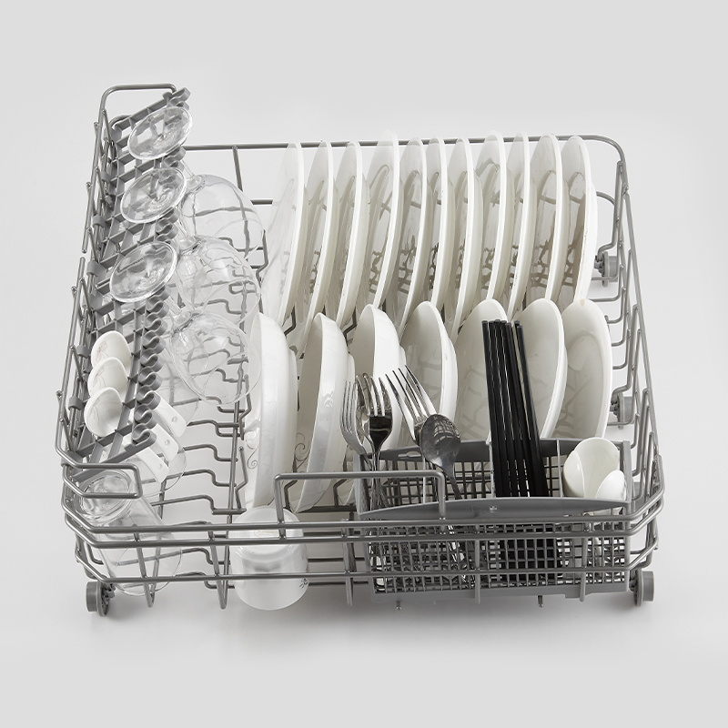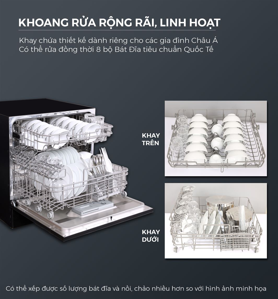 Khay dưới của máy có khoang chứa rộng hơn, cho phép rửa các loại nồi nấu, chảo, bát đĩa to….Các loại đĩa thìa, người dùng có thể cho vào vào giỏ màu xám ở trong khay rửa dưới hoặc xếp làm ngang, sao cho các không có bất cứ vật dụng nào cản trở vào 2 tay quay gạt nước của máy.