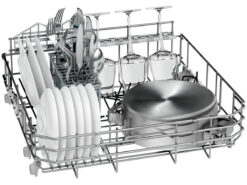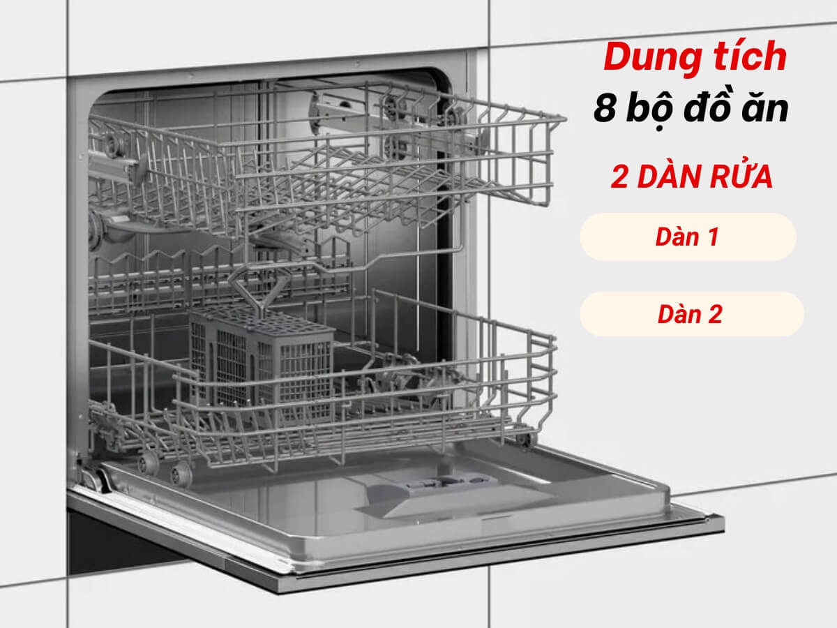 Máy có sức chứa 8 bộ đồ ăn châu Âu, phù hợp với gia đình 2 – 4 người. Hệ thống 2 giàn rửa linh hoạt dễ dàng điều chỉnh để phù hợp với các loại chén bát, nồi chảo có kích thước khác nhau.