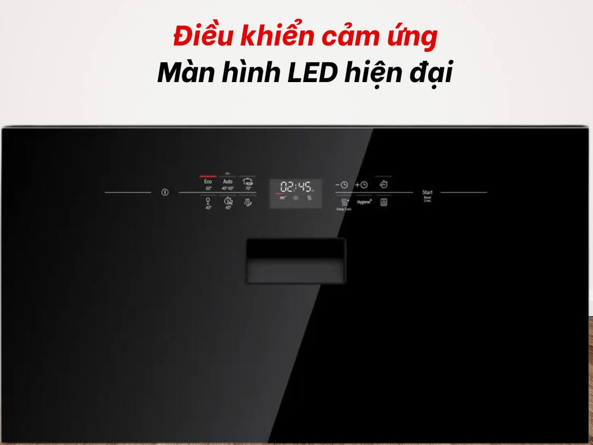 Máy sử dụng bảng điều khiển cảm ứng nhạy bén, dễ sử dụng ngay cả với người lớn tuổi. Màn hình LED hiện đại hiển thị rõ ràng thời gian còn lại và trạng thái hoạt động, giúp bạn dễ dàng theo dõi và quản lý chương trình rửa.