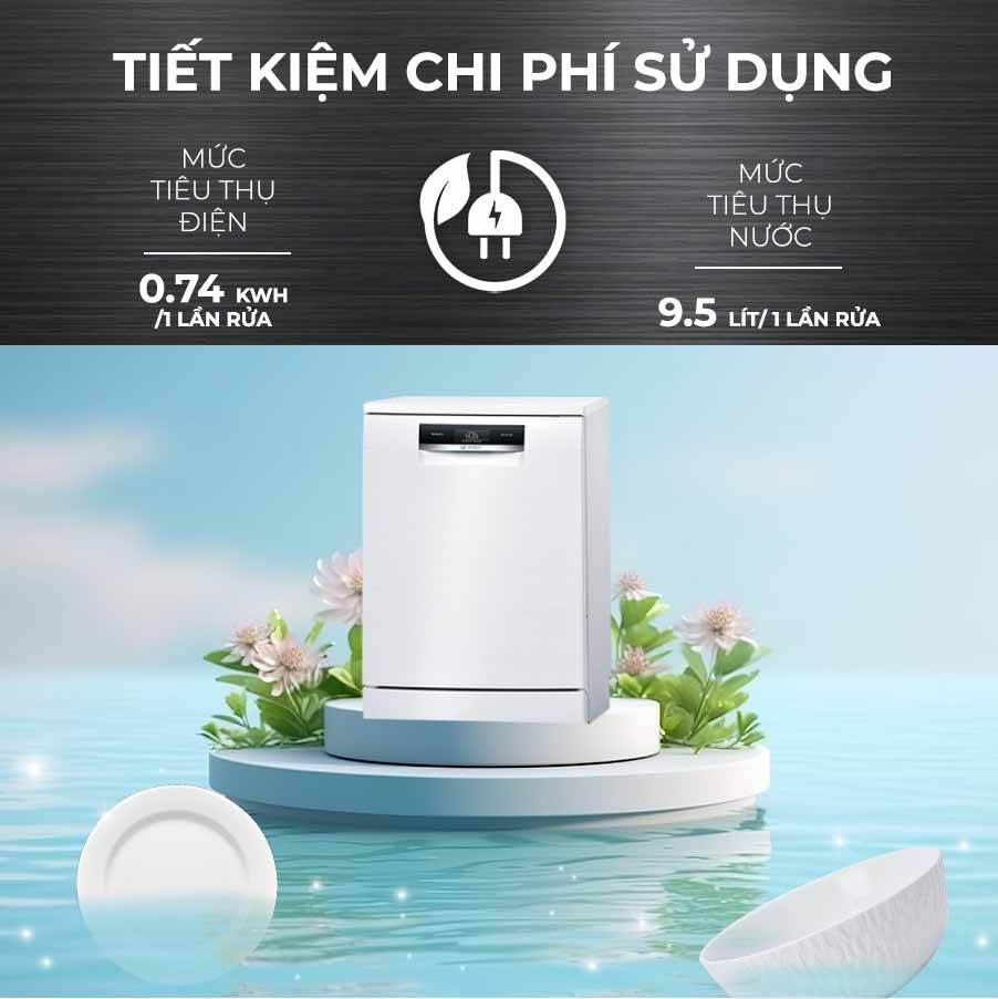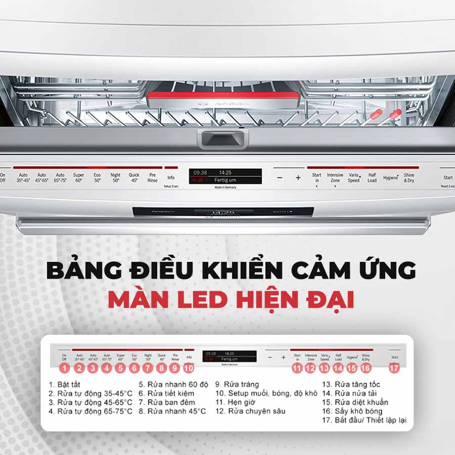 Bosch SMS88TW02M mang đến sự đa dạng với 8 chương trình rửa cơ bản, giúp người dùng dễ dàng lựa chọn chế độ phù hợp theo chất liệu, số lượng và độ bẩn của bát đĩa: Rửa tự động 35-45°C, Rửa tự động 45-65°C, Rửa tự động 65-75°C, Rửa nhanh 1.5h 60°C, Rửa tiết kiệm Eco 50°C, Rửa ban đêm 50°C, Rửa nhanh 45°C, Rửa tráng.
