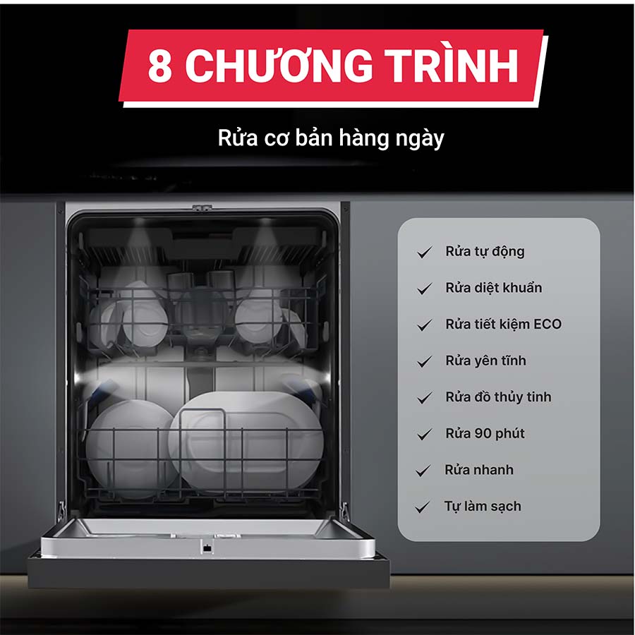 Chỉ với một chiếc máy rửa bát, việc dọn rửa sau mỗi bữa ăn không còn là nỗi ám ảnh với các gia đình, đặc biệt là khi có tiệc. Bởi thiết bị được trang bị tới 8 chương trình rửa khác nhau, từ rửa tiết kiệm đến chuyên sâu phù hợp với mọi loại chén bát và nhu cầu sử dụng: Rửa tự động, Rửa diệt khuẩn, Rửa tiết kiệm ECO, Rửa yên tĩnh, Rửa đồ thủy tinh, Rửa 90 phút, Rửa nhanh, Tự làm sạch.