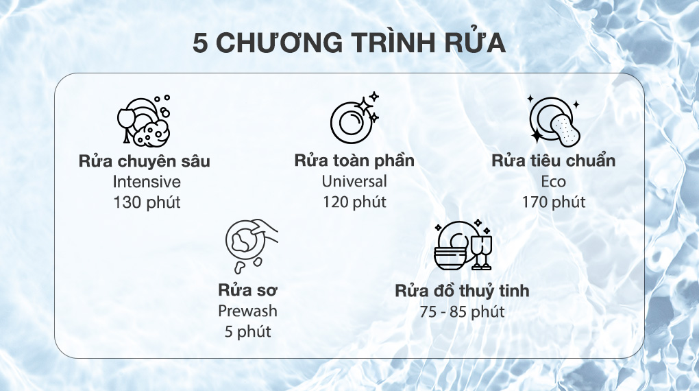 Máy sở hữu 5 chương trình rửa, đáp ứng cho nhu cầu rửa với mức độ bẩn và chất liệu khác nhau. Cụ thể như: rửa chuyên sâu (Intensive), rửa toàn phần (Universal), rửa tiêu chuẩn (Eco), rửa sơ (Prewash), rửa đồ thuỷ tinh.