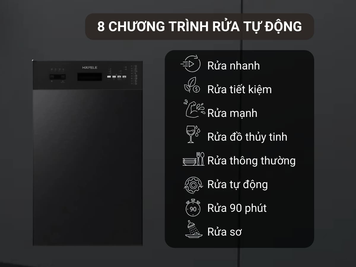 Máy rửa chén Hafele HDW-B4512B (533.23.340) được trang bị 8 chương trình rửa tự động, đem đến cho người dùng nhiều lựa chọn để phù hợp với khối lượng, độ bẩn của bát đĩa cũng như nhu cầu sử dụng của mình.