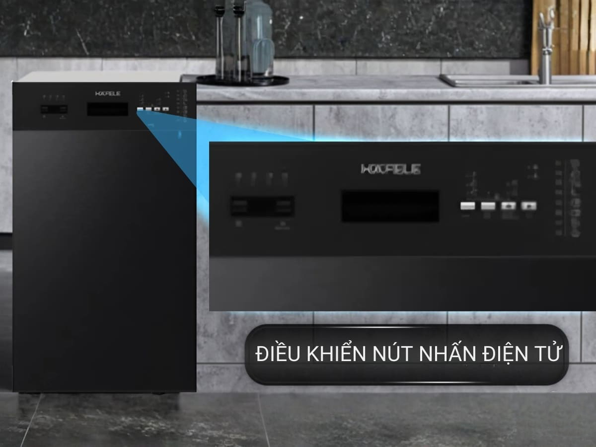 Máy rửa chén Hafele HDW-B4512B (533.23.340) trang bị hệ thống điều khiển nút nhấn điện tử và màn hình LED hiện đại, đảm bảo sử dụng dễ dàng, tiện lợi. Các chức năng được thể hiện bằng biểu tượng sắc nét, dễ quan sát, dễ hiểu, dễ sử dụng. Hệ thống bảng điều khiển được bố trí ngay trước cánh cửa máy, dễ dàng thao tác điều chỉnh máy chỉ cần nhấn nhẹ.