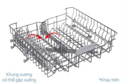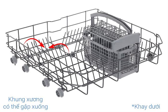 Khay trên có thể thay đổi chiều cao, tiện khi cần rửa ly cao, hộp thủy tinh hoặc nồi, chảo thấp nhưng miệng rộng. Khay dưới dành cho chén, dĩa, nồi chảo có kích thước lớn hơn. Cách bố trí này giúp nước và chất tẩy rửa tiếp cận từng bề mặt hiệu quả hơn, hạn chế việc chén dĩa che khuất nhau.
