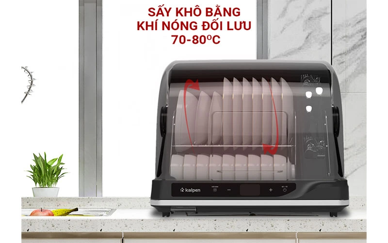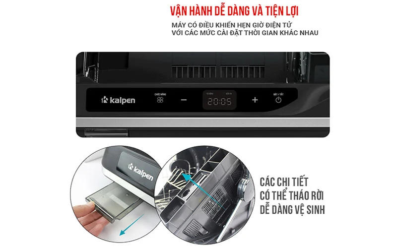 Máy sấy bát diệt khuẩn gia đình Kalpen DD99 được thiết kế bảng điều khiển cảm ứng ở mặt trước của máy, gồm các phím chức năng và màn hình LED hiển thị thông số hoạt động của máy, cho bạn dễ dàng quan sát và thao tác điều chỉnh sử dụng máy tiện dụng. Máy có nhiệt độ sấy 80 độ C nên ngoài chức năng sấy bát đĩa ra, còn có thể dùng để sấy khô rau củ và nhiều đồ dùng khác trong nhà bếp, đồng thời cũng có thể dùng như một kệ để bát đĩa vô cùng tiện dụng, còn có chức năng hẹn giờ cho bạn chủ động được thời gian, sau khi hết thời gian cài đặt máy sẽ tự động ngắt điện, không mất thời gian đứng canh tắt máy.