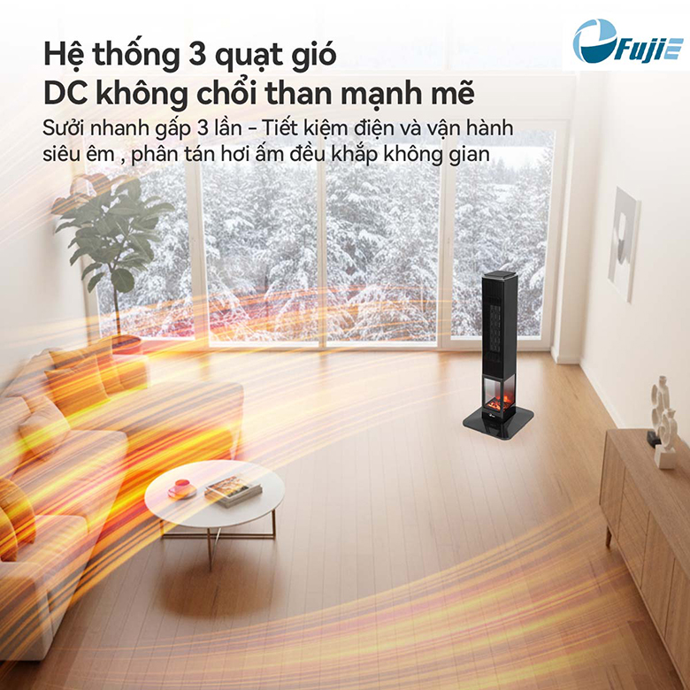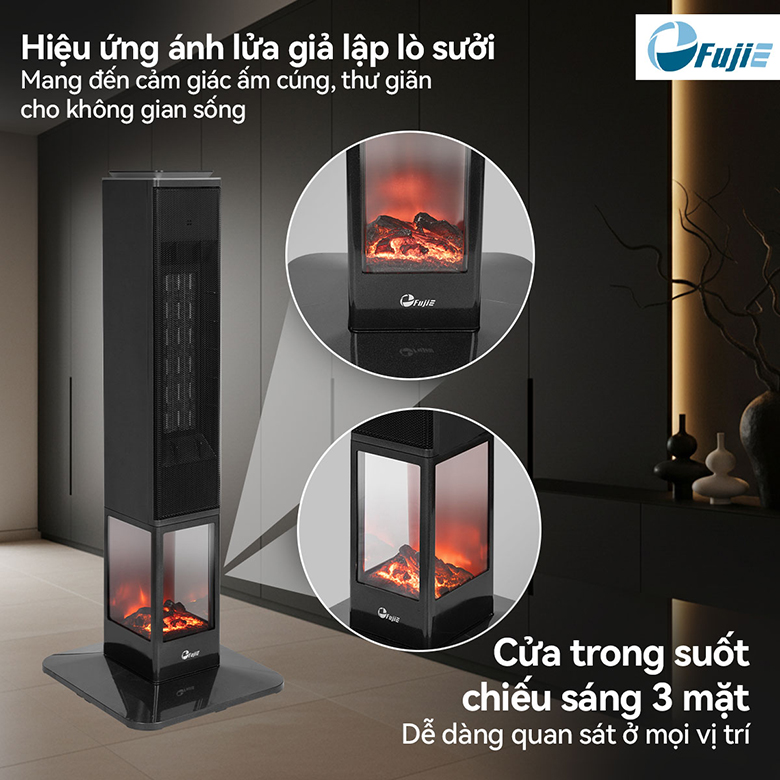Điểm nổi bật không thể bỏ qua ở quạt sưởi gốm FujiE VH08 chính là hiệu ứng ánh lửa mô phỏng lò sưởi. Cửa sổ nhựa trong suốt phía dưới thân máy được thiết kế chiếu sáng ba mặt, tạo cảm giác như đang ngồi cạnh lò sưởi thực sự. Hiệu ứng này không chỉ mang lại vẻ đẹp thẩm mỹ mà còn giúp không gian trở nên sang trọng, ấm cúng, thư giãn hơn – lý tưởng cho những buổi tối quây quần cùng gia đình hay những phút giây nghỉ ngơi sau một ngày dài.