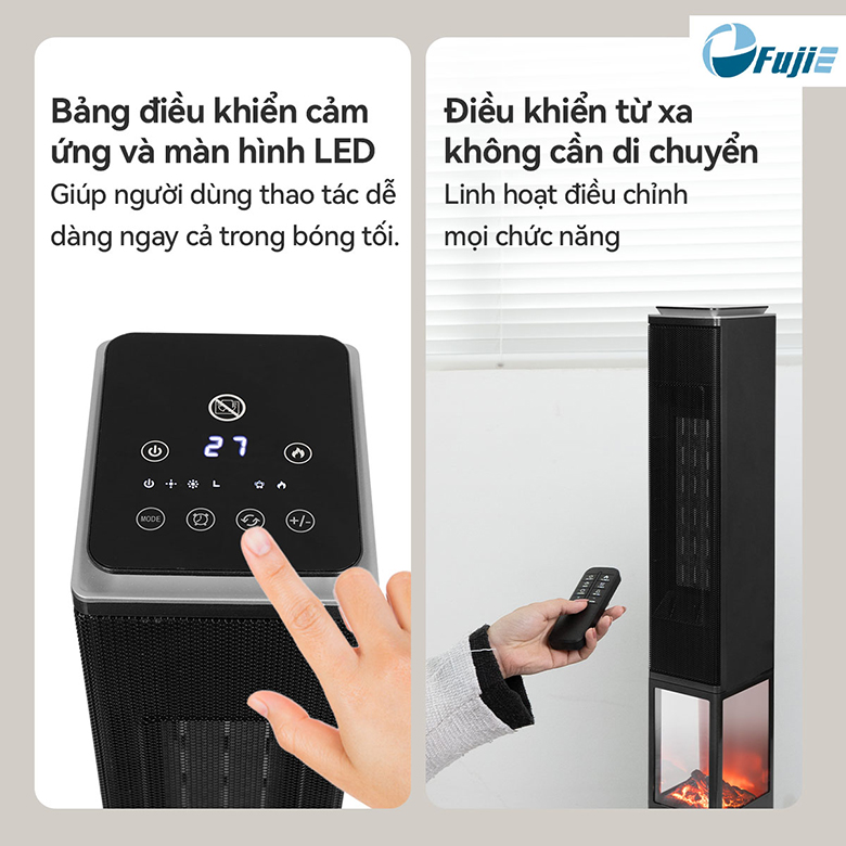 Máy sưởi FujiE VH08 được tích hợp bảng điều khiển cảm ứng hiện đại cùng màn hình LED sắc nét, giúp bạn dễ dàng điều chỉnh ngay cả trong điều kiện thiếu sáng. Ngoài ra, sản phẩm còn có remote điều khiển từ xa, cho phép điều chỉnh mọi chức năng một cách tiện lợi mà không cần di chuyển khi đang nghỉ ngơi.