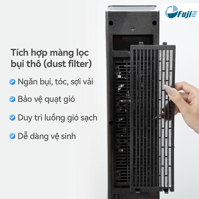 Máy sưởi VH08 được trang bị màng lọc bụi thô (Dust Filter) giúp ngăn tóc, bụi lớn và sợi vải không lọt vào thân máy – vừa giúp bảo vệ quạt gió, duy trì hiệu suất hoạt động trong thời gian dài vừa đảm bảo luồng không khí sạch, an toàn cho sức khỏe người dùng. Màng lọc có thể tháo rời và vệ sinh dễ dàng.