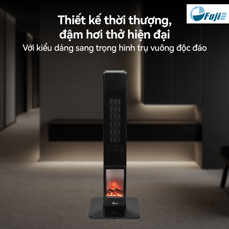 FujiE VH08 sở hữu thiết kế hình trụ vuông tối giản, lịch lãm, kết hợp cùng tông màu đen xám hiện đại. Đây không chỉ là một thiết bị sưởi thông thường, mà còn là điểm nhấn nội thất tinh tế, phù hợp với nhiều phong cách không gian từ cổ điển đến hiện đại.