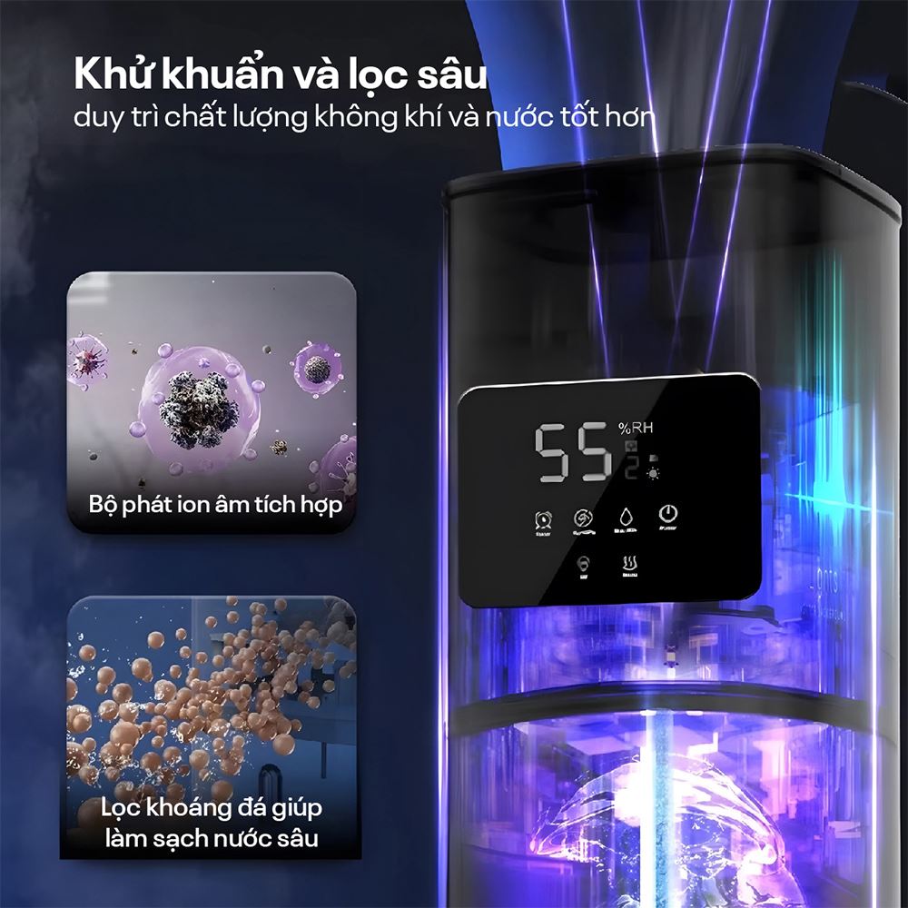 Đầu phun có khả năng xoay 360°, giúp luồng hơi sương lan tỏa đồng đều khắp căn phòng, đảm bảo độ ẩm được duy trì ổn định mà không bỏ sót bất kỳ góc nào. Chế độ hẹn giờ linh hoạt từ 1 đến 8 tiếng mang lại sự chủ động trong việc kiểm soát thời gian hoạt động của máy. Đặc biệt, sản phẩm được trang bị điều khiển từ xa tiện lợi, cho phép bạn dễ dàng điều chỉnh các chế độ mà không cần di chuyển đến gần thiết bị – vô cùng phù hợp với không gian phòng ngủ hoặc phòng khách.