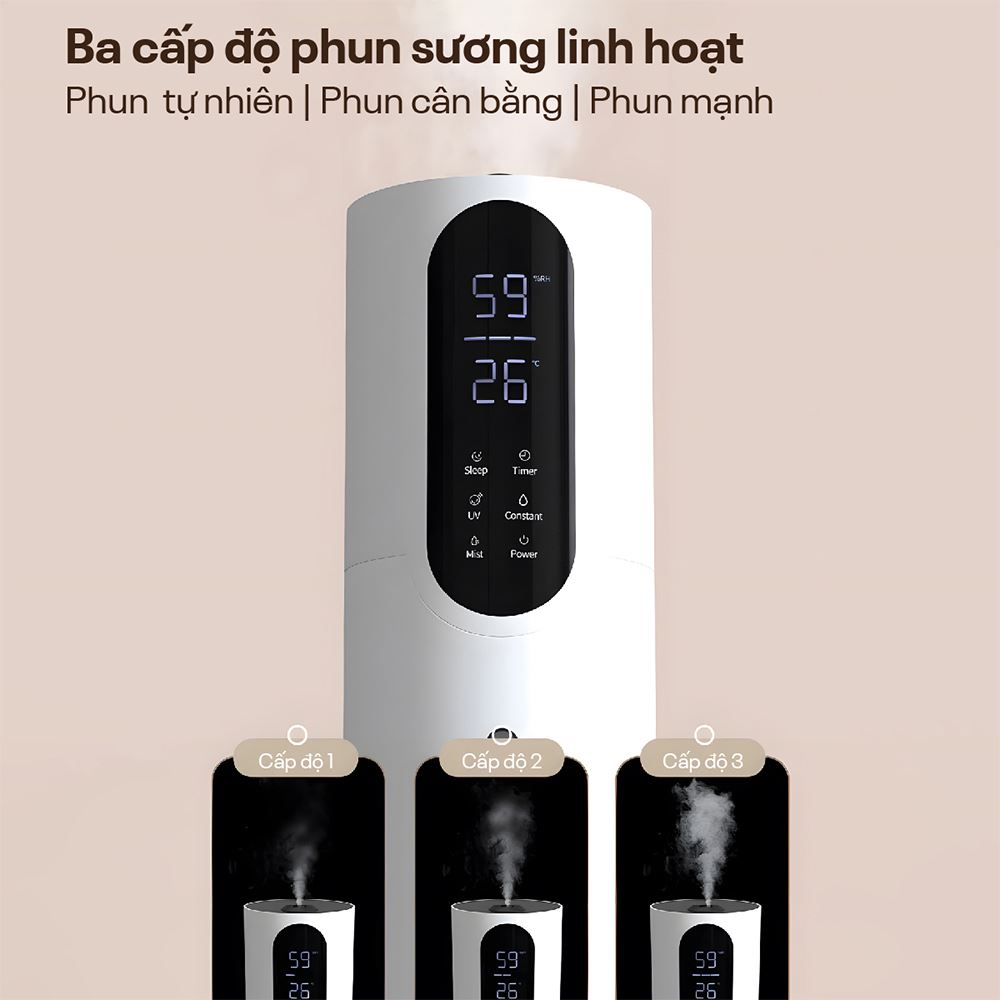 Máy hoạt động với công suất 28W, cho khả năng phun sương đến 300 ml/h đủ để duy trì không khí dễ chịu trong phòng có diện tích vừa và lớn. Đầu phun xoay 360° giúp các hạt sương phủ đều khắp không gian, máy cung cấp ba cấp độ phun sương tùy chỉnh linh hoạt: phun tự nhiên, cân bằng và mạnh, đảm bảo độ ẩm lý tưởng theo từng nhu cầu sử dụng.