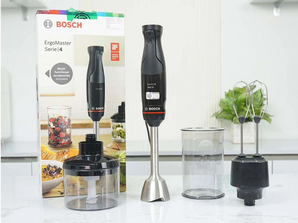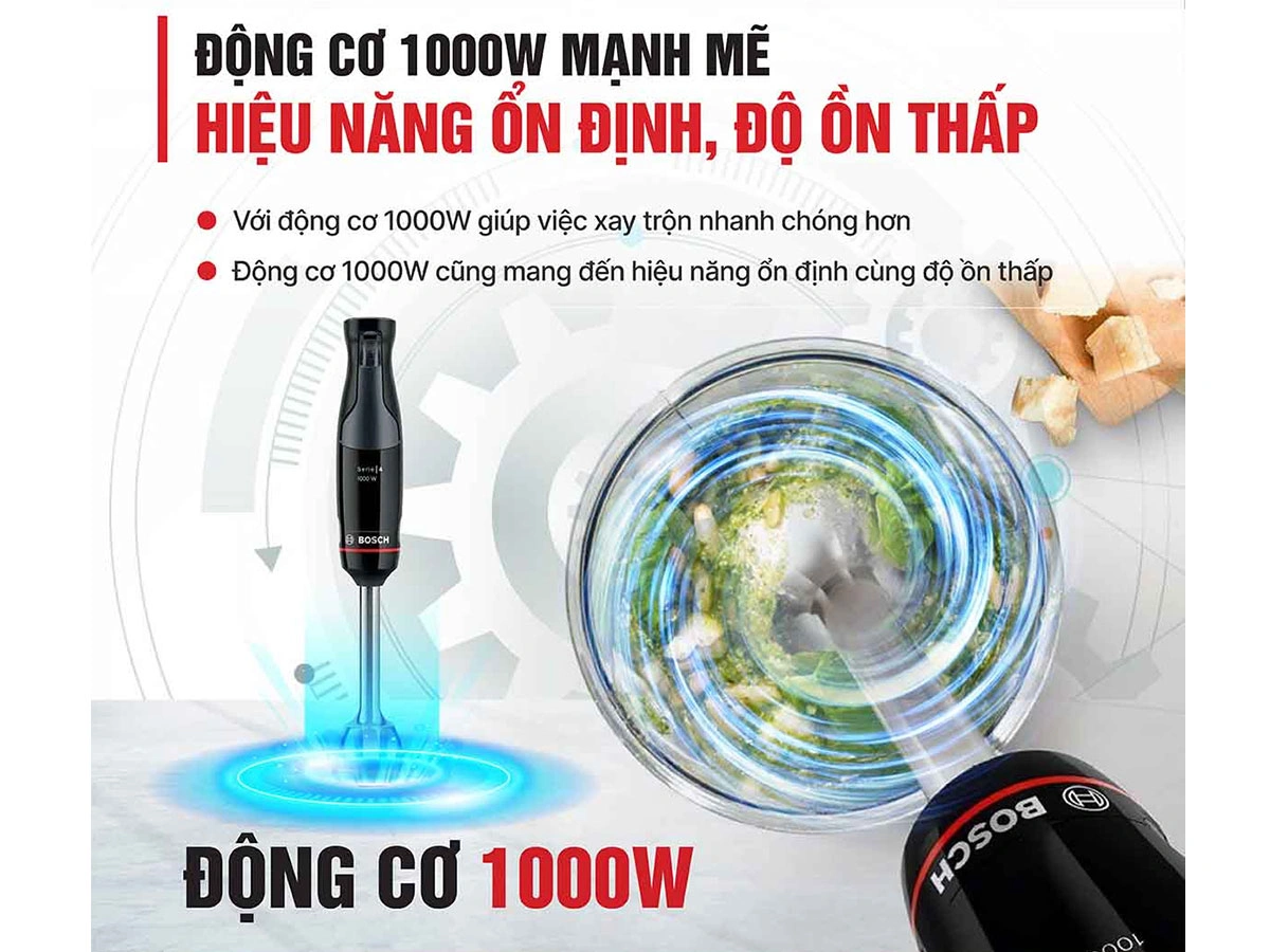 Máy xay cầm tay Bosch sở hữu công suất 1.000W, hỗ trợ xử lý đa dạng nguyên liệu từ trái cây mềm, rau củ, cháo nóng đến các loại hạt hoặc thịt đã sơ chế. Kết hợp với lưỡi dao thép không gỉ sắc bén, máy giúp nguyên liệu được xay nhuyễn và đồng đều hơn, hạn chế tình trạng vón cục khi chế biến sinh tố, súp hoặc nước sốt.
