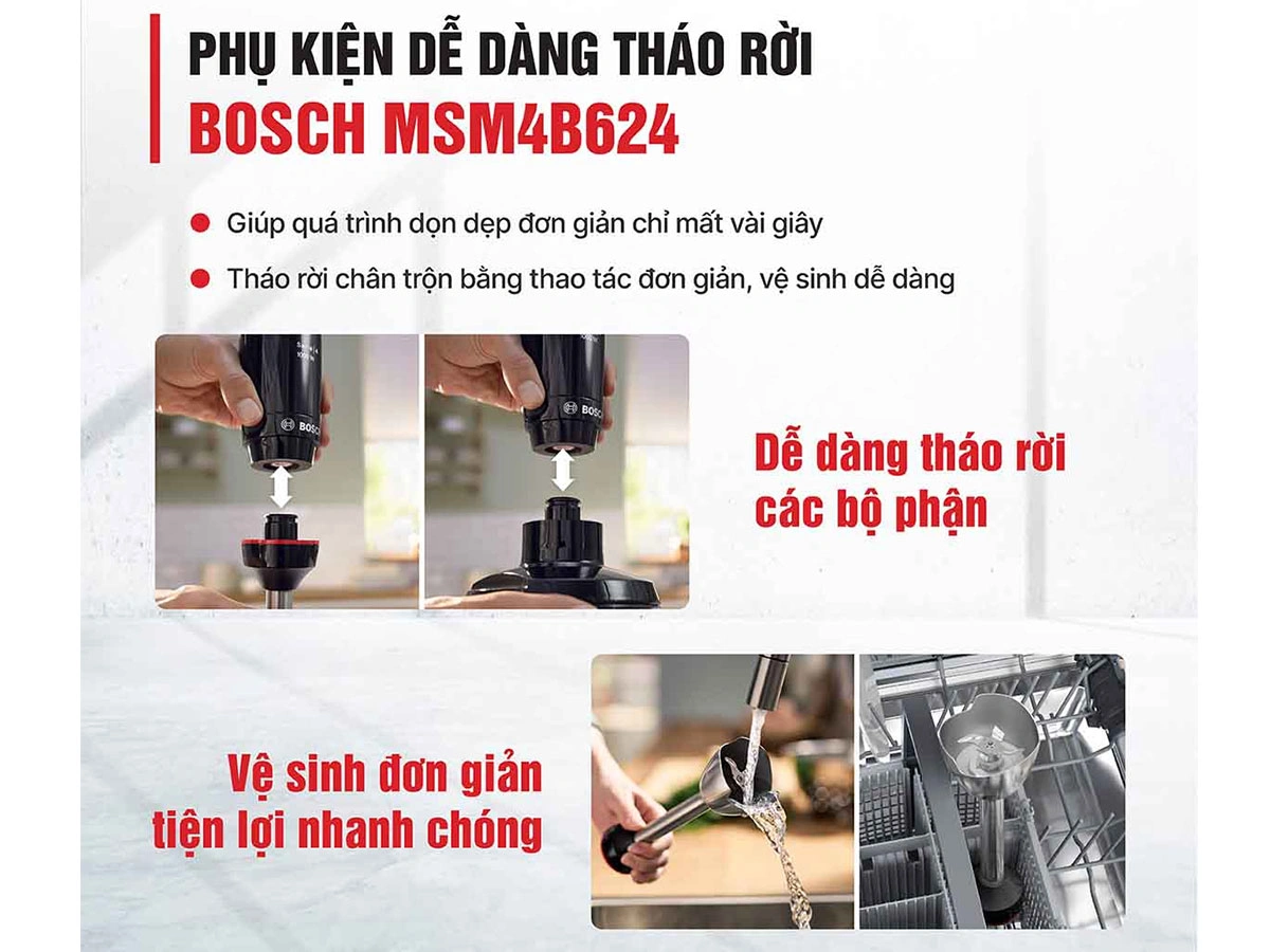 Máy xay cầm tay Bosch MSM4B624 được trang bị cơ chế gắn tháo thông minh, cho phép người dùng tháo rời trục xay và các bộ phận chỉ với thao tác đơn giản. Nhờ đó, quá trình vệ sinh sau khi sử dụng trở nên nhanh chóng và thuận tiện hơn, đặc biệt khi chế biến các món có mùi mạnh hoặc nhiều dầu mỡ. Các bộ phận có thể rửa trực tiếp dưới vòi nước hoặc lau bằng khăn mềm, giúp tiết kiệm thời gian dọn dẹp và góp phần duy trì độ sạch sẽ, an toàn vệ sinh thực phẩm trong quá trình sử dụng lâu dài.