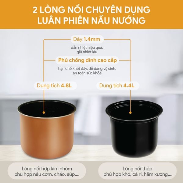 - 01 lòng nồi thép không gỉ dung tích 4.4L: lý tưởng cho các món cần giữ nhiệt lâu như kho, cà ri, hầm xương….