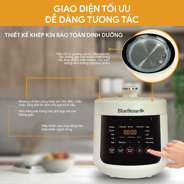 BlueStone PCB-5760 được lập trình sẵn 12 chế độ nấu tự động, từ nấu cơm, nấu cháo, hầm xương, làm bánh, hấp, hâm nóng… chỉ với một lần chạm. Bạn không cần canh lửa hay lo món bị khê – nồi sẽ tự động tính toán thời gian, nhiệt độ và áp suất phù hợp để tạo nên món ăn hoàn hảo.