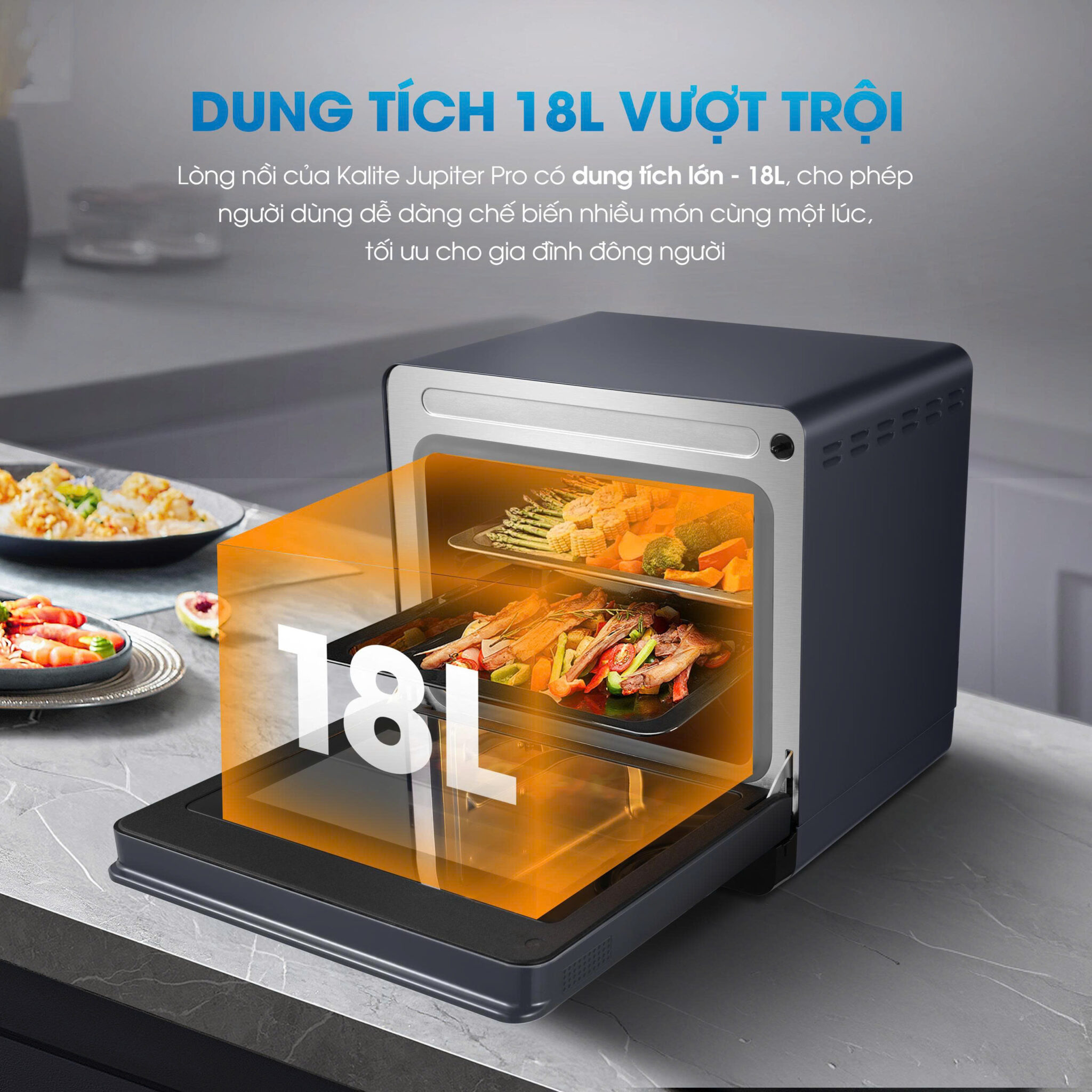 Lòng nồi Kalite Jupiter Pro sở hữu dung tích lớn lên đến 18L, cho phép chế biến lượng thực phẩm lớn hoặc nhiều món trong cùng một lần nấu. Không gian khoang nấu rộng rãi giúp sắp xếp thực phẩm linh hoạt, hạn chế việc phải chia nhỏ mẻ nấu, đặc biệt thuận tiện khi chế biến các món nguyên con hoặc khay thực phẩm lớn.