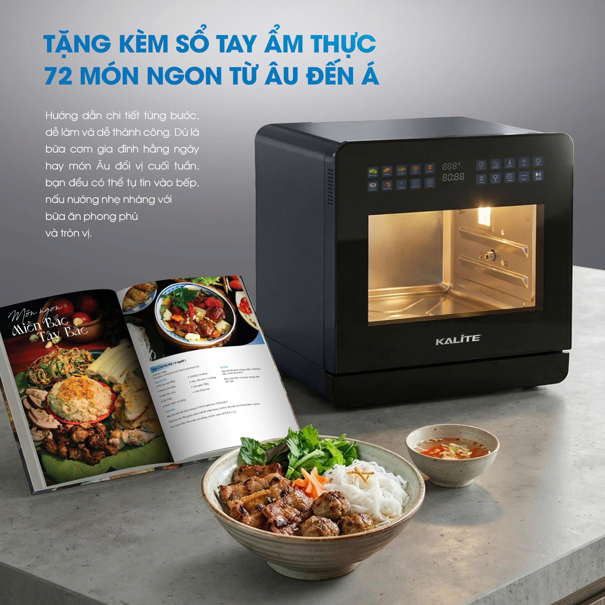 Bên cạnh các chế độ nấu và công thức tự động được cài đặt sẵn trên máy, Kalite gửi tặng người dùng sổ tay ẩm thực với 72 món ăn từ Âu đến Á, giúp mở rộng thêm ý tưởng và lựa chọn món ăn trong quá trình sử dụng. Nội dung sổ tay bao gồm nhiều món ăn quen thuộc trong bữa cơm gia đình lẫn các món Âu đổi vị cuối tuần, đáp ứng đa dạng nhu cầu nấu nướng hằng ngày.