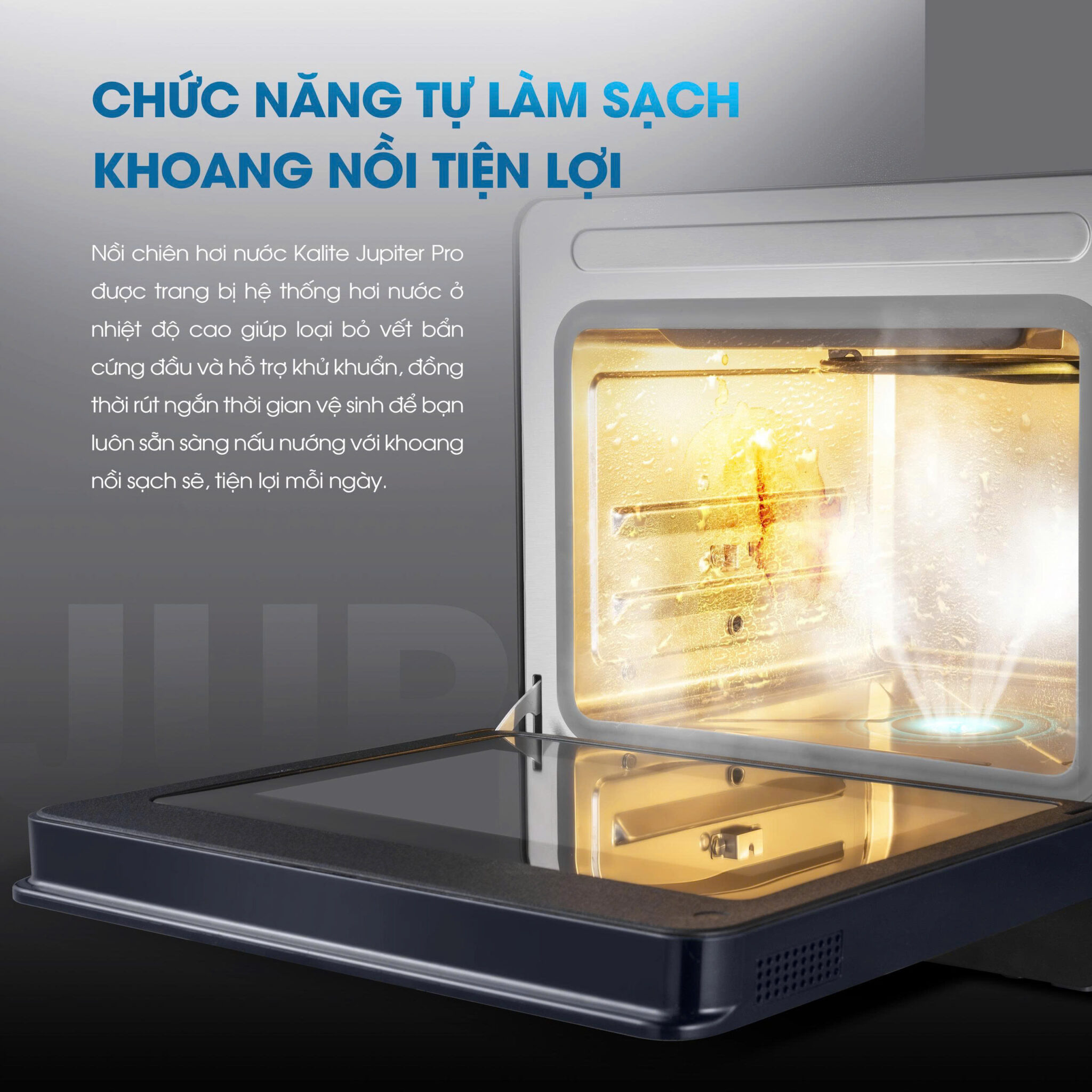 Nồi chiên hơi nước Kalite Jupiter Pro được tích hợp chức năng tự làm sạch khoang nồi bằng hơi nước ở nhiệt độ cao, giúp làm mềm và tách rời dầu mỡ cùng cặn thực phẩm bám trên bề mặt sau quá trình nấu. Luồng hơi nước được phân bổ đều khắp khoang, hỗ trợ khử mùi thực phẩm và hạn chế vi khuẩn tích tụ, giúp bề mặt bên trong trở nên dễ vệ sinh hơn.