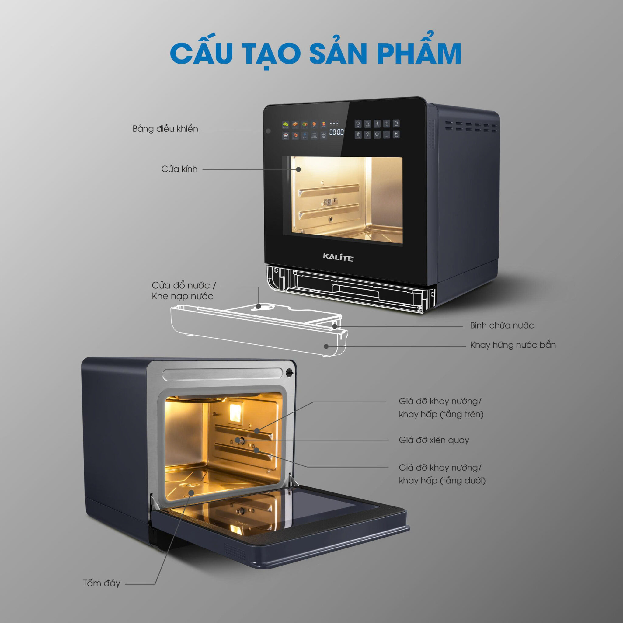 Nồi chiên hơi nước Kalite Jupiter Pro được thiết kế như một trung tâm nấu nướng đa năng cao cấp, tích hợp đồng thời 10 chức năng trong cùng một thiết bị gồm: chiên không dầu, chiên hơi nước, hấp, nướng, quay, rã đông, hâm nóng, sấy khô, làm bánh và tự làm sạch bằng hơi nước. Nhờ khả năng kết hợp linh hoạt giữa nhiệt đối lưu và hơi nước ở nhiều mức nhiệt khác nhau, sản phẩm đáp ứng trọn vẹn các công đoạn nấu nướng, từ sơ chế đến hoàn thiện món ăn, mà không cần phụ thuộc vào nhiều thiết bị riêng lẻ.
