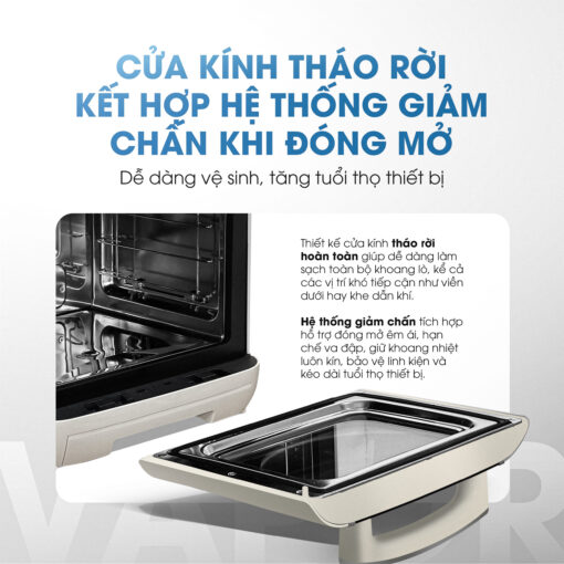 - Dễ dàng vệ sinh, tăng tuổi thọ thiết bị: Cửa kính được thiết kế tháo rời hoàn toàn, giúp bạn dễ dàng làm sạch toàn bộ khoang lò, ngay cả những vị trí khó tiếp cận nhất.