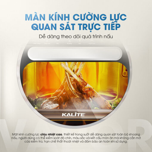 Kalite Vapor được trang bị màn kính cường lực chịu nhiệt cao, trong suốt, giúp bạn dễ dàng quan sát toàn bộ quá trình nấu nướng bên trong mà không cần mở cửa. Việc này không chỉ giúp kiểm soát độ chín của món ăn mà còn hạn chế thất thoát nhiệt, đảm bảo món ăn chín đều và tiết kiệm điện.