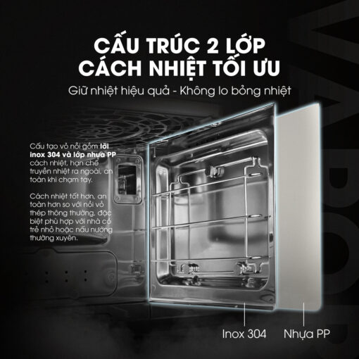 Đặc biệt, nồi có cấu trúc 2 lớp cách nhiệt tối ưu với lớp vỏ thép không gỉ bên trong và lớp nhựa PP bên ngoài. Thiết kế này giúp giữ nhiệt hiệu quả bên trong khoang lò và hạn chế truyền nhiệt ra ngoài, đảm bảo an toàn tuyệt đối, đặc biệt với những gia đình có trẻ nhỏ.”