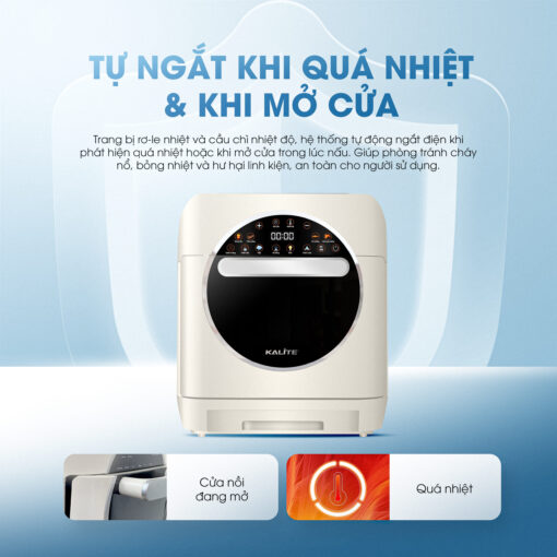 Kalite Vapor đặt sự an toàn của người dùng lên hàng đầu với tính năng tự ngắt điện thông minh trong hai trường hợp: khi phát hiện quá nhiệt hoặc khi cửa nồi đang mở trong lúc nấu. Tính năng này giúp phòng tránh nguy cơ cháy nổ, bỏng nhiệt và hư hại linh kiện, đặc biệt mang lại sự an tâm tuyệt đối cho các gia đình có trẻ nhỏ hiếu động.
