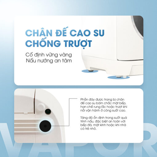 Ngoài ra, nồi còn được trang bị chân đế cao su chống trượt vững chắc. Thiết kế này giúp cố định nồi ổn định trên mọi bề mặt bếp, hạn chế rung lắc hay trượt trong quá trình vận hành, đảm bảo an toàn tối đa cho mọi thành viên trong gia đình.”