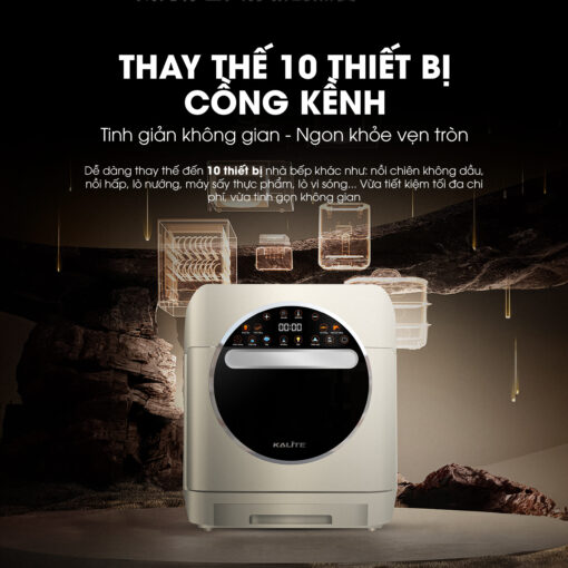 Với Kalite Vapor, Kalite đã tạo ra một thiết bị đa năng, định hình lại chuẩn mực của một căn bếp hiện đại. Sản phẩm được nghiên cứu và phát triển để thay thế hiệu quả 10 thiết bị bếp cồng kềnh như nồi chiên không dầu, nồi hấp, lò nướng, máy sấy, lò vi sóng, máy nướng bánh mì, máy làm sữa chua,… Nhờ đó, Kalite Vapor không chỉ giải phóng không gian, mang đến sự gọn gàng, tinh tế cho căn bếp của bạn mà còn tối ưu hóa chi phí đầu tư ban đầu.