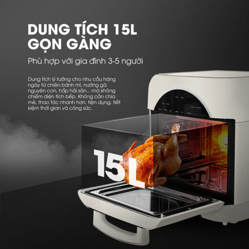 Tuy sở hữu công suất khủng nhưng Kalite Vapor lại có thiết kế vô cùng nhỏ gọn với dung tích 15L, rất phù hợp với nhu cầu sử dụng hàng ngày của gia đình từ 3-5 người. Với dung tích lý tưởng này, bạn có thể dễ dàng chế biến các món như gà nướng nguyên con hay hấp cá lớn mà không cần phải chia mẻ, vừa tiện lợi vừa tiết kiệm thời gian và công sức.