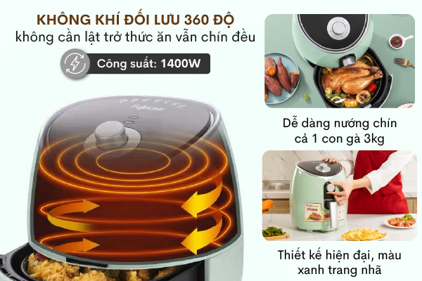 Nồi chiên không dầu Fujihome A4 với dung tích 5 lít công suất 1400W sẽ mang đến bạn và gia đình những những món chiên nướng giòn rụm, màu sắc hấp dẫn mà không hề ngấy mỡ.