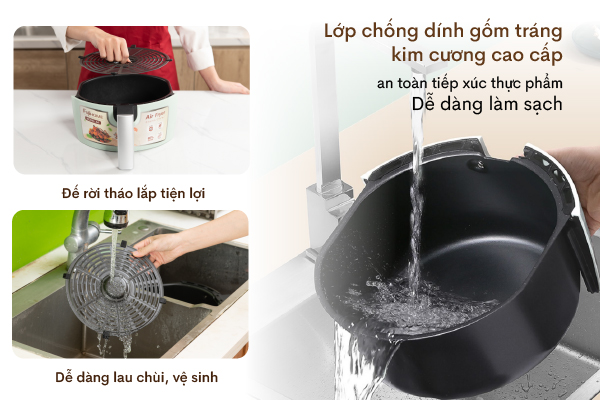 Các bộ phận của nồi chiên không dầu dễ dàng tháo lắp, giỏ chiên và khay hứng mỡ đều được phủ lớp chống dính cao cấp, hạn chế bám dính thực phẩm giúp vệ sinh dễ dàng, không mất nhiều thời gian. Lớp chống dính cao cấp không bị bong tróc khi chà rửa, đảm bảo vệ sinh, an toàn cho người sử dụng.