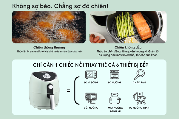 Thực phẩm khi chiên không cần sử dụng đến dầu mỡ, mà lượng mỡ thừa từ thực phẩm được tự động tách ra và chảy xuống khay hứng mỡ bên dưới, giúp loại bỏ 80% lượng chất béo trong thực phẩm. Món chiên, nướng tuy đã tách béo nhưng không hề bị khô mà vẫn giữ trọn dinh dưỡng.