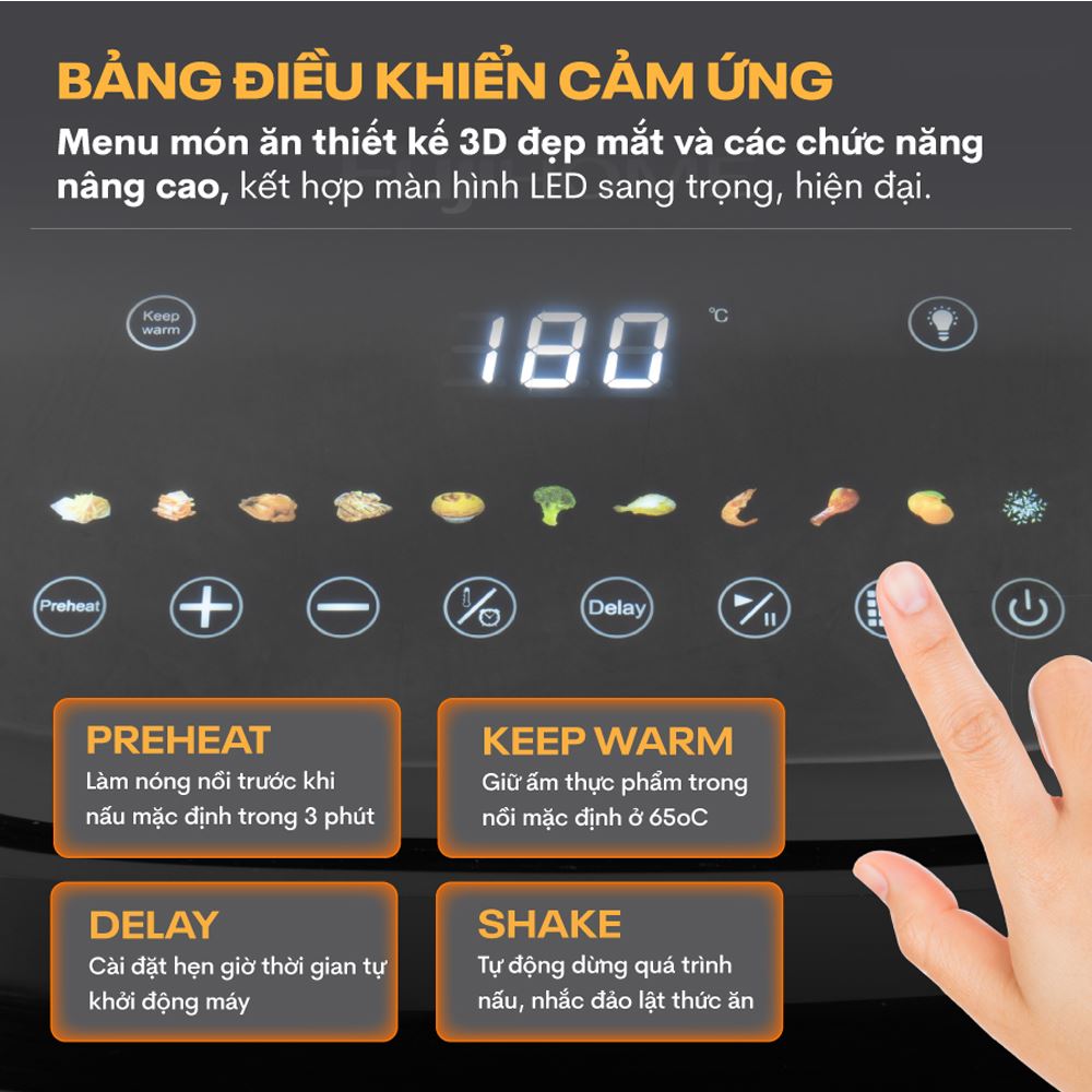 Trải nghiệm nấu ăn trở nên dễ dàng hơn bao giờ hết với bảng điều khiển cảm ứng hiện đại của sản phẩm. Chỉ với vài chạm nhẹ, bạn có thể lựa chọn 1 trong 11 chương trình nấu cài đặt sẵn, từ chiên khoai tây, nướng gà, sấy khô hoa quả đến làm bánh, đáp ứng mọi nhu cầu ẩm thực của gia đình. Với sự tiện lợi này, chiếc nồi chiên không dầu cảm ứng này giúp bạn tiết kiệm thời gian và công sức, ngay cả những người ít vào bếp cũng có thể tự tin tạo ra các món ăn hấp dẫn.