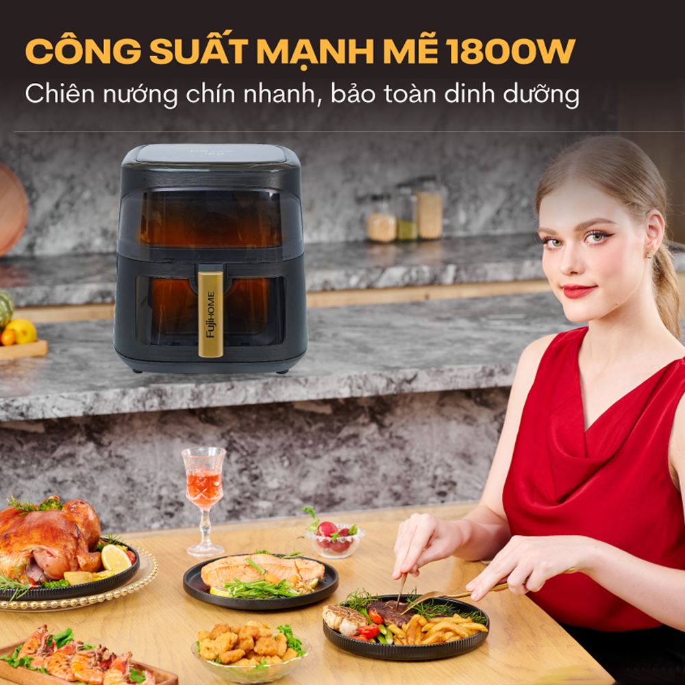 Sản phẩm sở hữu dung tích tổng và sử dụng lên đến 8 lít, là lựa chọn lý tưởng cho các gia đình đông người từ 7 đến 10 thành viên, giúp bạn dễ dàng chuẩn bị những bữa tiệc hoặc các món ăn lớn mà không cần chia nhỏ. Với công suất mạnh mẽ từ 1600 – 1800W, nồi chiên không dầu FUJIHOME A8DG1NEW đảm bảo thực phẩm được làm nóng nhanh chóng, chín đều và giòn rụm bên ngoài, mềm ẩm bên trong.