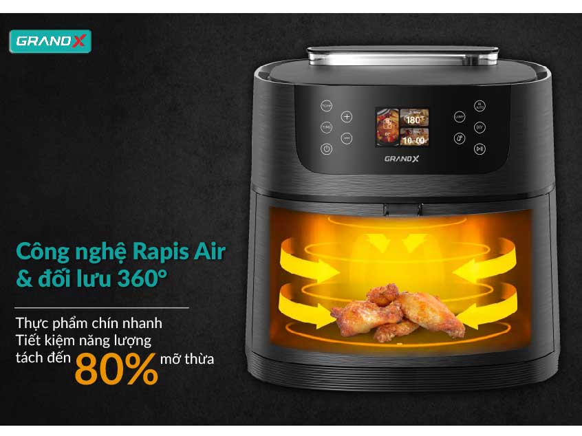 Công nghệ Rapid Air của nồi chiên không dầu GrandX GX-AR08 Smart(GX-AR08Ai) giúp đốt nóng chân không, đảm bảo thực phẩm chín nhanh và đều. Điều này không chỉ tiết kiệm thời gian nấu nướng mà còn giúp thực phẩm không bị khô, giữ được độ tươi ngon.