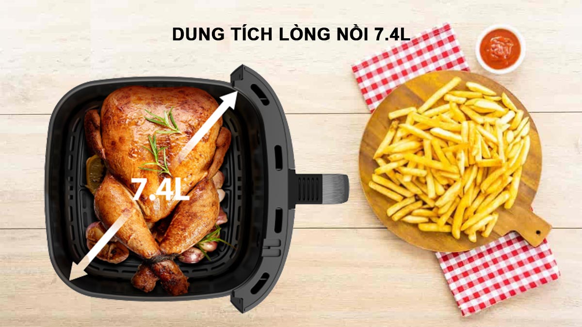 Dung tích lòng nồi lên đến 7.4 lít, chiên nướng gà nguyên con khoảng 2.2kg, nguyên miếng pizza hoặc chế biến được khối lượng thực phẩm lớn trong một lần, tiết kiệm thời gian và công sức hiệu quả.