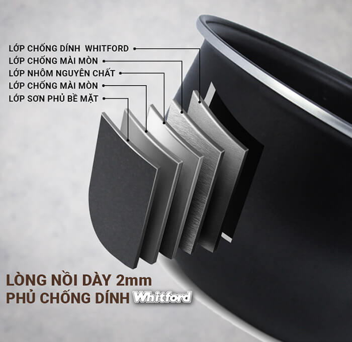 Nồi cơm điện nắp gài này được hoàn thiện từ chất liệu cao cấp với thân nồi được làm từ kim loại được phủ sơn tĩnh điện sáng bóng, chống bám bẩn hay trầy xước, dễ dàng vệ sinh tạo độ bền mới cho nồi, chân đế, quai xách và nắp bằng nhựa cách nhiệt cao cấp đảm bảo an toàn cho người sử dụng, lòng nồi dạng niêu bằng hợp kim nhôm phủ lớp chống dính Teflon an toàn cho sức khỏe, giúp nấu cơm không bị dính hay cháy khét, dễ dàng vệ sinh.